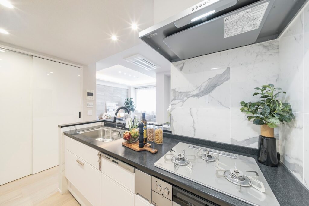 この事例では、キッチンカウンターの前面や、コンロ前の壁(キッチンパネルの代替)に大理石調のタイルを採用することで、空間全体に圧倒的な清潔感と洗練された印象を与えました。