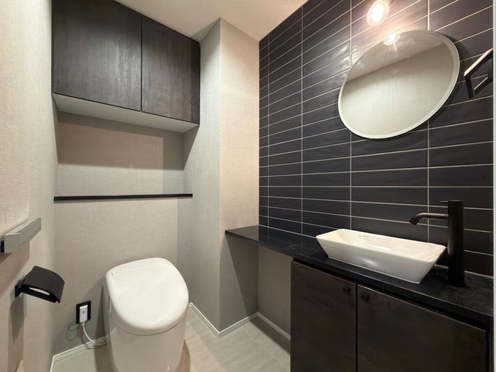 この事例では、トイレの壁の一部にマットな質感の鮮やかな黒を大胆に採用し、無機質でどこか武骨なインダストリアルな雰囲気を演出しました。