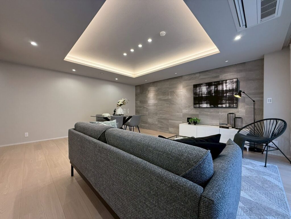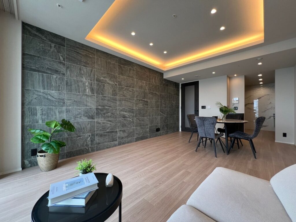 この事例では、高級感を高めるために光沢を抑えた大判のマットなグレーウォールを採用しました。これにより、重厚感とモダンさが両立されています。