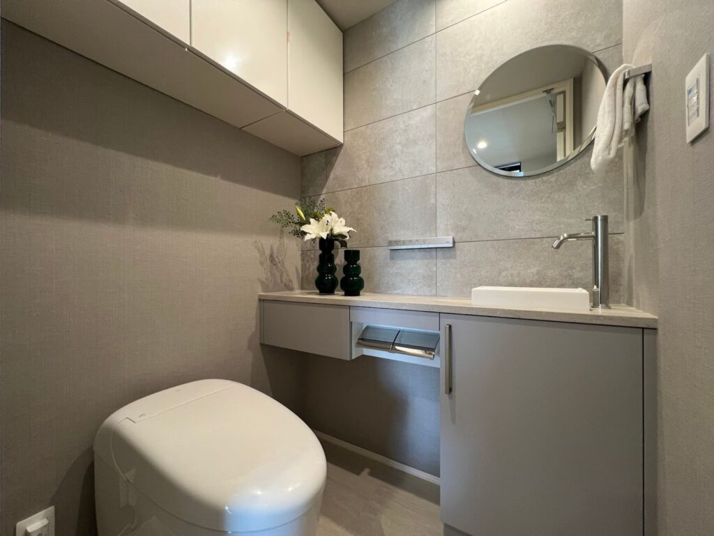 トイレの壁、床、手洗いカウンターなどをグレージュで統一し、単調になるのを避けるため、素材の質感に変化を与えたアクセントクロスを採用しました。