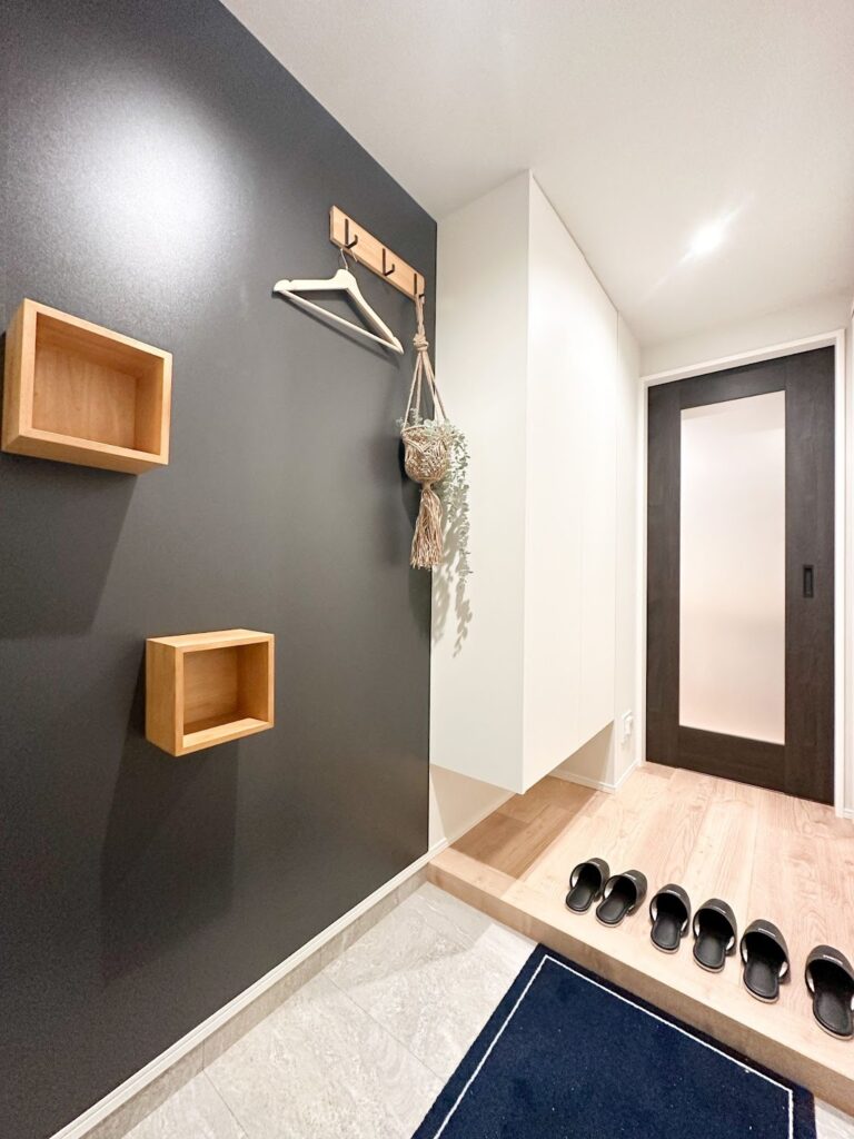 本事例では、玄関の壁に黒のマグネットウォールを採用しました。