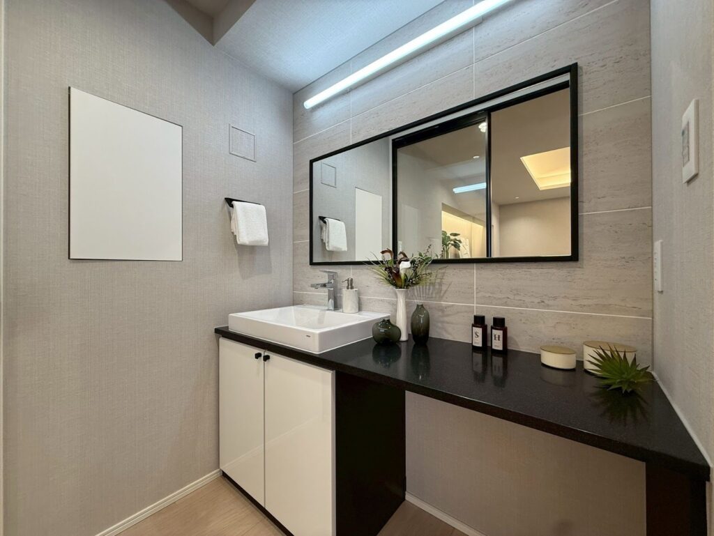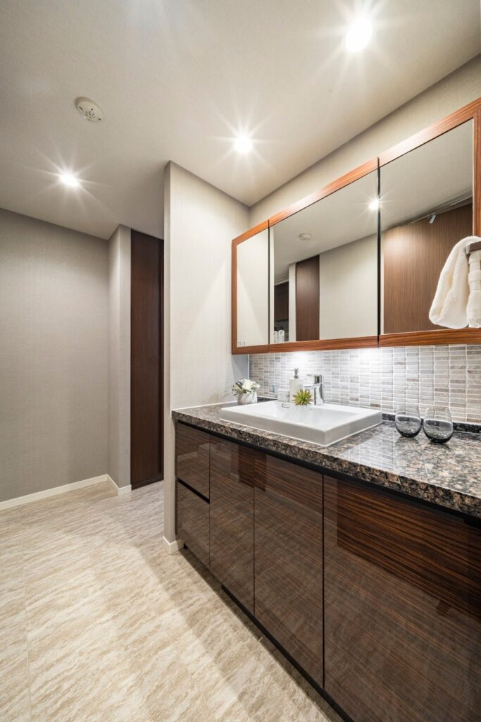 洗面所は、湿気が多く清潔感が重要視される空間です。アクセントタイル・クロスは、耐久性の高さとホテルライクな上質感を重視して選びましょう。