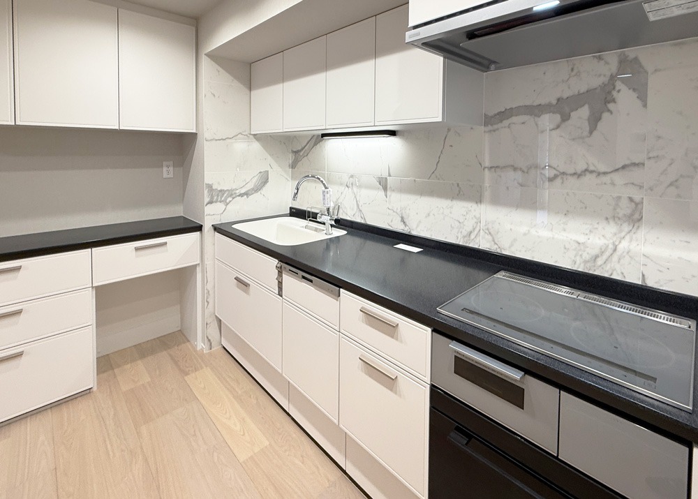 パックシステムのリノベーションでは、マンション・お部屋に合った機能性の高いシステムキッチンを標準採用しています。作業効率を大幅に向上させるために、容量の大きな「深型食洗機」を搭載し、快適に作業できるキッチン空間をデザインしています。