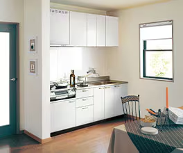 省スペース性に優れており、狭い間取りにも設置しやすいのが特徴です。作業動線は横一方向になりますが、その分調理スペースからシンクへの移動がシンプルに行えます。