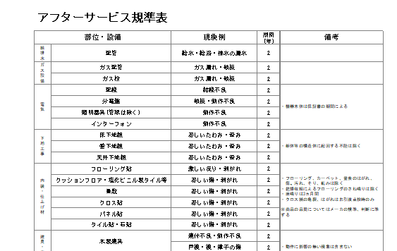 アフターサービス規準表とは、無償対応の範囲、補修方法、除外される項目などを明確に記載した書類です。不具合が起こった場合、どのようなサービスが受けられるのかが一目で分かります。