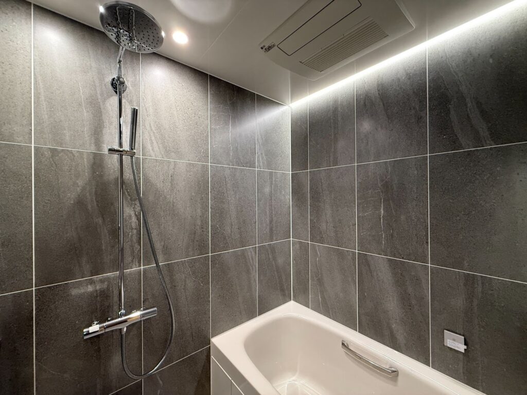この事例では、バスルームに木目調の高級感あるタイルとライン照明を使用し、高級スパのような雰囲気を演出しました。